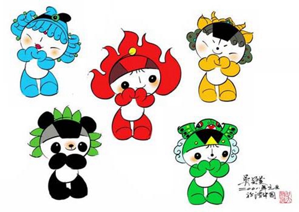 2005年3月,吴冠英教授接到奥组委通知参与六个方案的修改工作,之后决定对设计作品“喜娃”进行修改。画了几千个稿样,经过数次修改定型,五个凝聚专家心血的“福娃”跃然纸上:用熊猫代表森林,用鱼娃代表水,用火娃代表奥运圣火,用藏羚羊代表大地,用北京特有的沙燕风筝代表天空———“福娃”就这样诞生了。