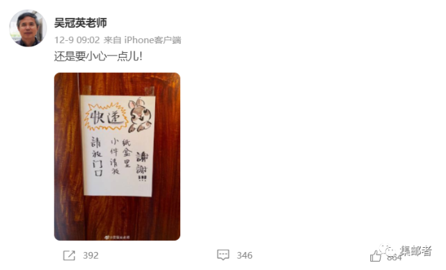 吴冠英在今年12月9日在微博上分享了含有兔子作品的快递提示,并留下文字“还是要小心一点儿”,此后再未发过微博。