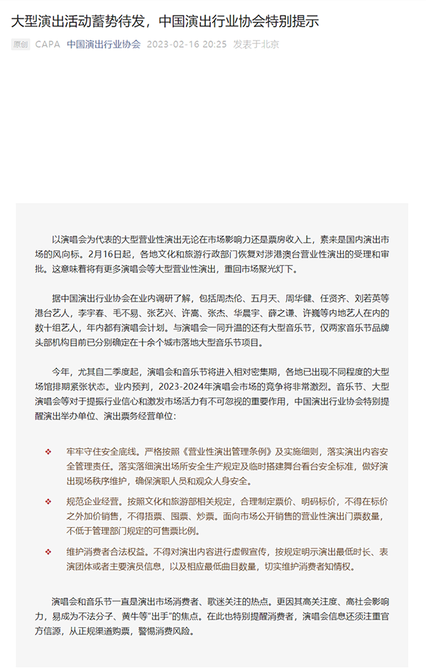 中国演出行业协会还提到,今年,尤其自二季度起,演唱会和音乐节将进入相对密集期,各地已出现不同程度的大型场馆排期紧张状态。业内预判,2023-2024年演唱会市场的竞争将非常激烈。与此同时,票务与黄牛乘势而来,代抢、包内场票、付定金就能“手到票来”等相关信息随之出现,并已让不少消费者上当受骗。在此也特别提醒消费者,演唱会信息还须注重官方信源,从正规渠道购票,警惕消费风险。