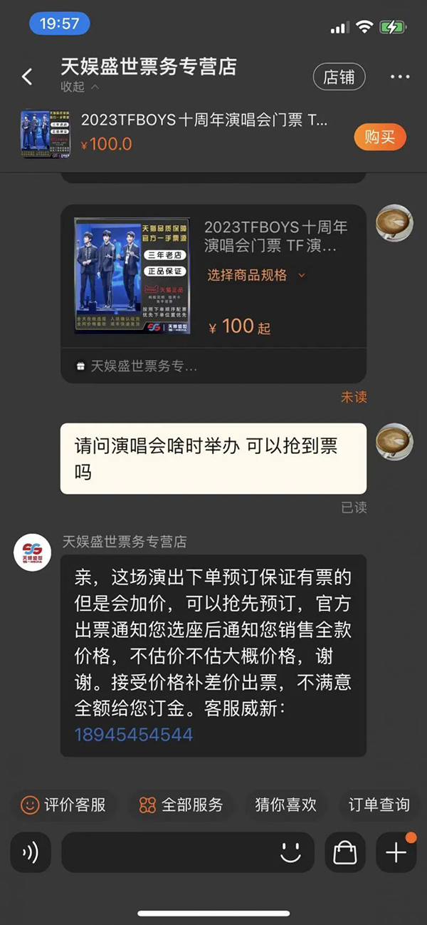 尽管演唱会的时间、地点均未官宣,粉丝已经开始为能否抢到门票而焦虑,引来大批自称资深票务人员实为黄牛的卖家争相“上链接”,代抢、包内场票、预付定金送亲笔签名的宣传信息频繁在相关微博话题下出现,还打包票付定金就能“手到票来”。在TFBOYS相关微博话题中,“代抢保真”“多年票务稳”“预定保证有票”分散在每个话题帖的评论区。不少代抢卖家信誓旦旦承诺“下单预定保证有票但是会加价”,而对于售后却语焉不详:“接受价格补差价出票,不满意全额给您订金。”