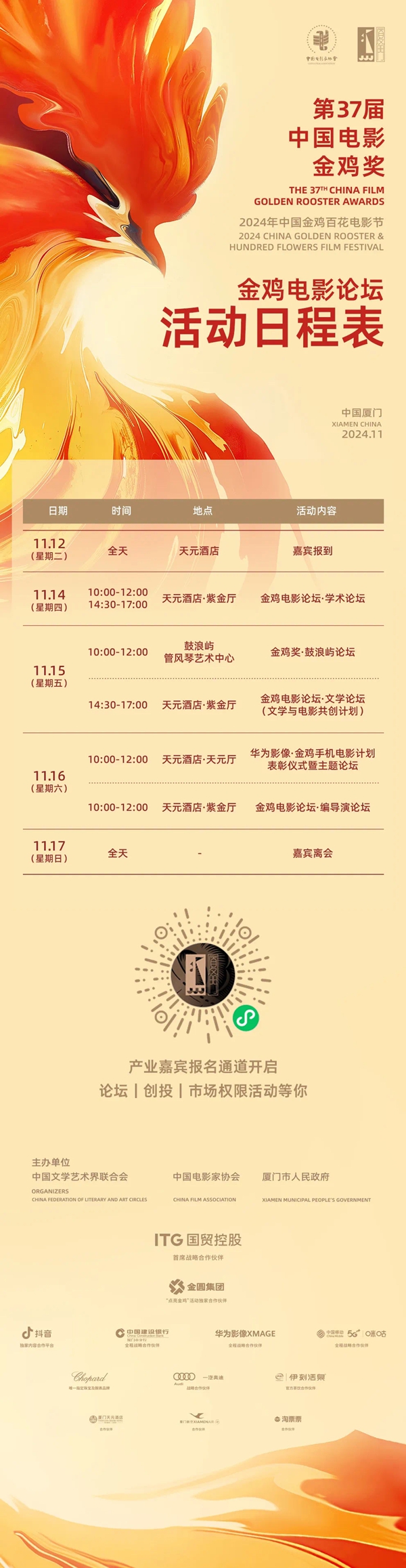 2024年中国金鸡百花电影节金鸡电影论坛将于11月14日至16日在鼓浪屿及厦门天元酒店举办。本届金鸡电影论坛共设置四场主题论坛,包括鼓浪屿论坛、学术论坛、文学论坛和编导演论坛。