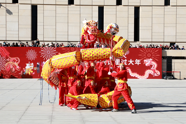 河北易县摆字龙灯作为压轴出场。表演中,巨龙腾飞,舞者们巧妙运用十三节龙身加领龙绣球摆出“时和岁丰、年年大吉”等吉祥祝语,表达了对国家繁荣昌盛、人民幸福安康的美好祝愿。