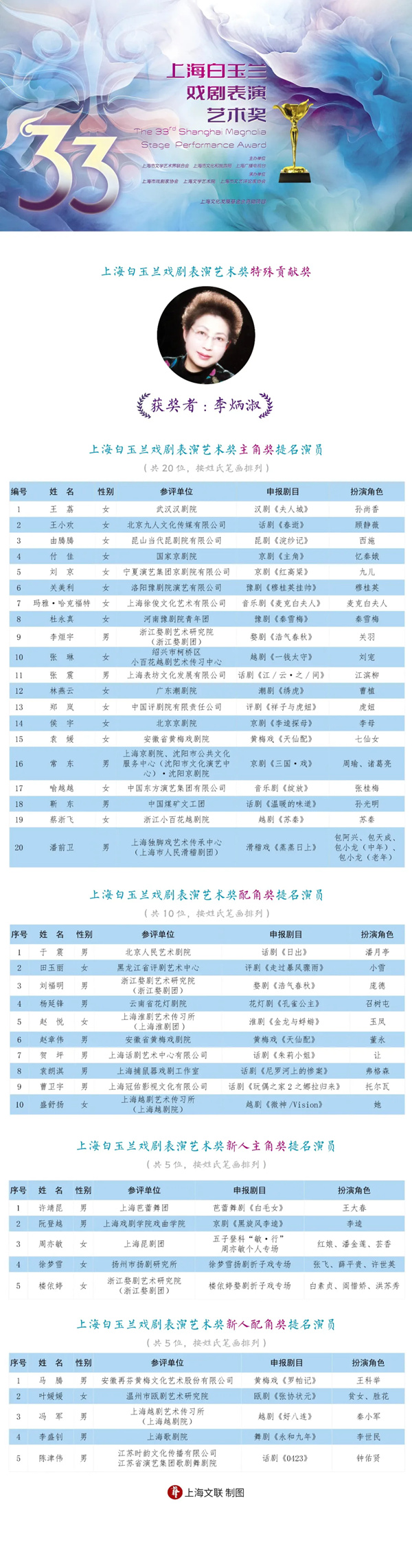 由上海市文学艺术界联合会、上海市文化和旅游局、上海广播电视台共同主办,上海市戏剧家协会、上海文学艺术院、上海市文艺评论家协会共同承办的第33届上海白玉兰戏剧表演艺术奖(以下简称白玉兰戏剧奖)各奖项提名名单已经产生,提名奖获奖演员共40人,其中主角奖20人、配角奖10人、新人主角奖5人、新人配角奖5人。本届白玉兰戏剧奖特殊贡献奖授予著名表演艺术家李炳淑,奖掖其为中国戏剧艺术事业作出的突出贡献。