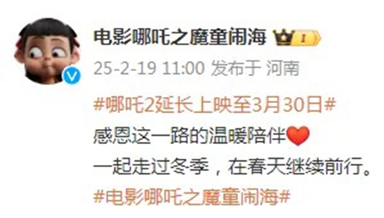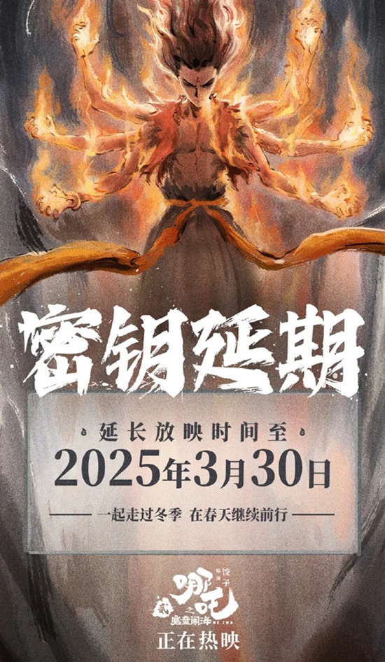 《哪吒2》延长上映至3月30日