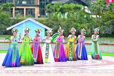“嘿,什么花开三月三勒,嘿嘹嘹啰……”31日一大早,广西南宁民歌湖畔传来阵阵悠扬的歌声。“新刘三姐”陈慧身着广西民族服饰,脚踩平衡车闪亮登场,她一边灵活穿梭,一边同舞者对山歌,现场气氛热烈。