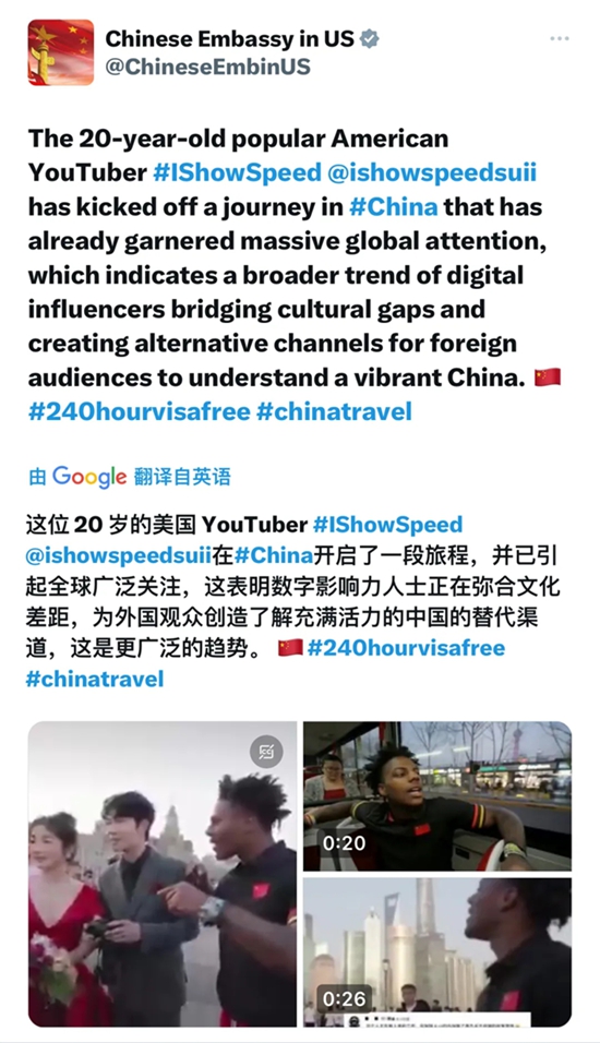 最近引发广泛关注的美国博主IShowSpeed(中文昵称为“甲亢哥”)便是其中一例。他先后在上海、北京、河南、成都等地展开直播,迅速在外网掀起了舆论热潮。中国驻美国大使馆也在海外社交平台上点赞,表示这位20岁的美国人气网红,正在用数字的方式弥合文化鸿沟,并为外国观众创造了解中国的新渠道。不少海外网友感叹“这就是中国的样子”,相关话题一度冲上微博热搜。