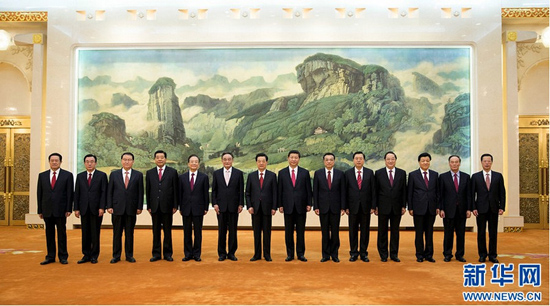 11月15日,国家主席胡锦涛,新当选的中共中央总书记、中共中央军委主席习近平,十七届中共中央政治局其他常委吴邦国、温家宝、贾庆林、李长春、贺国强、周永康,十八届中共中央政治局其他常委李克强、张德江、俞正声、刘云山、王岐山、张高丽一起合影。新华社记者兰红光摄