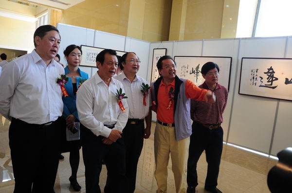 李达球、苏道俨、潘琦、张秀隆、韦守德、韦凤云等领导在展厅观赏书法作品。