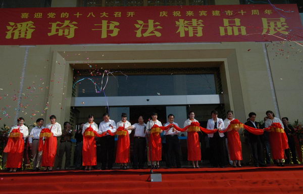 10月31日,“喜迎党的十八大召开 庆祝来宾建市十周年”潘琦书法精品展在来宾市开幕。图为李达球、苏道俨、王革冰、张秀隆、韦守德、韦克义等领导为展览剪彩。