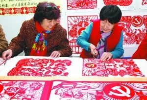 怀柔区泉河街道馥郁苑社区教师公寓的10名社区居民剪纸爱好者,正在居委会活动室为喜迎十八大剪纸作品进行创作。他们创作的28幅剪纸作品包含了“回忆光辉、延安宝塔、南湖岁月、遵义会议、风雨历程、幸福生活、党的十八大”等内容,回顾了中国共产党的光辉战斗历程,歌颂了党的丰功伟绩,表达了社区居民对党的深情祝福。(特约摄影 卜向东)