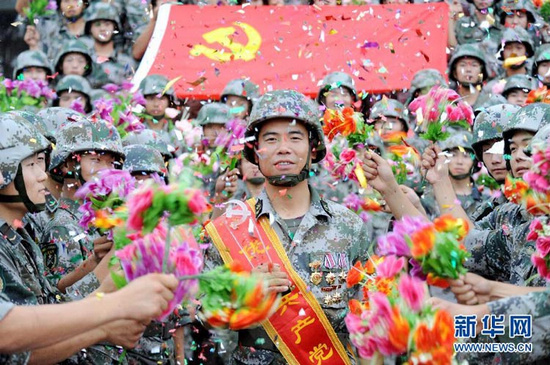 贾元友(中)被军区评为“优秀共产党员”,载誉归来受到连队官兵热烈欢迎(2011年7月1日摄)。新华社发(秦德禄 摄)