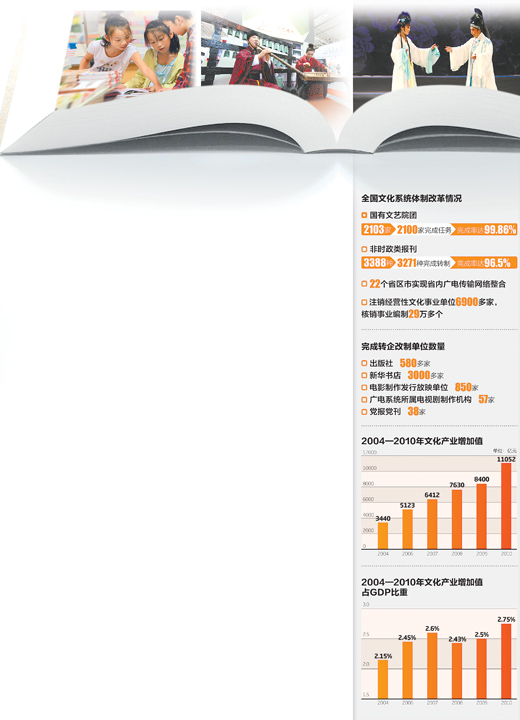 国家统计局发布的数据显示, 2004年以来文化产业的年均增长率都在15%以上,比同期国内生产总值的增速高6个百分点。2010年我国文化产业增加值为11052亿元,占同期GDP的2.75%。