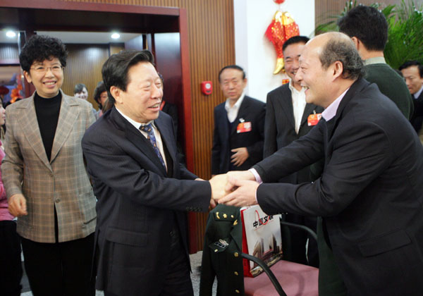 3月2日,2012年文艺界全国人大代表全国政协委员联谊会在京举行。图为孙家正、赵实与文艺家亲切交谈。中国文艺网 孟祥宁 摄