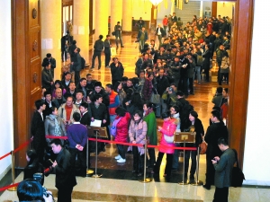 记者排出的大队很难说有多长,因为最长的时候在政协礼堂里折了好几道弯,但数十米肯定是有了,有记者戏称,“真是‘九曲十八弯’啊!”排队领证记者有上千人,为了不让场面混乱,领证的地点专设入口和出口。在入口处,有两名工作人员在维持秩序,一次只能放三个人进去。
