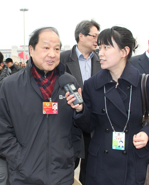 3月3日,中国人民政治协商会议第十一届全国委员会第五次会议在北京人民大会堂开幕。图为张和平委员接受媒体采访。中国文艺网 张悦 摄