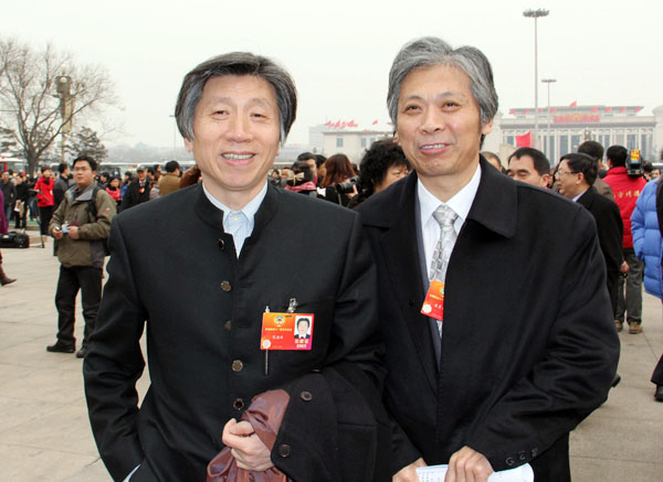 3月3日,中国人民政治协商会议第十一届全国委员会第五次会议在北京人民大会堂开幕。图为范迪安委员(左)与唐勇力委员步入会场。中国文艺网 张悦 摄