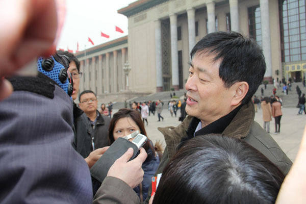 3月3日,中国人民政治协商会议第十一届全国委员会第五次会议在北京人民大会堂开幕。图为濮存昕委员接受媒体采访。中国文艺网 张悦 摄