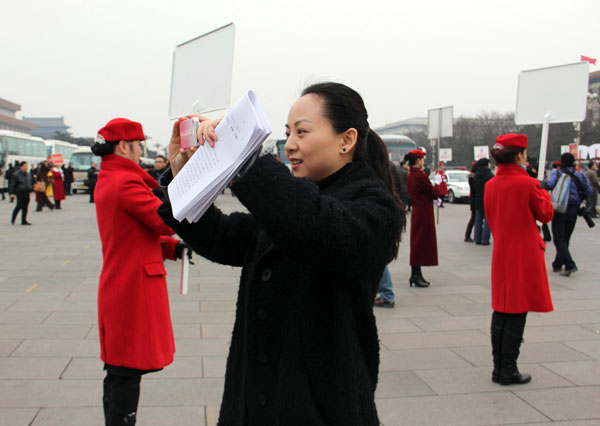 3月3日,中国人民政治协商会议第十一届全国委员会第五次会议在北京人民大会堂开幕。图为邰丽华委员为身着红衣的饭店迎宾员拍照。中国文艺网 张悦 摄