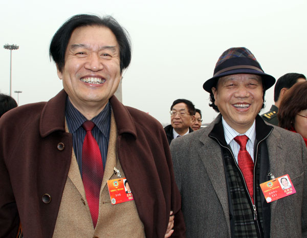 3月3日,中国人民政治协商会议第十一届全国委员会第五次会议在北京人民大会堂开幕。图为尼玛泽仁委员(右)与王兴东委员步入会场。中国文艺网 王春梅 摄