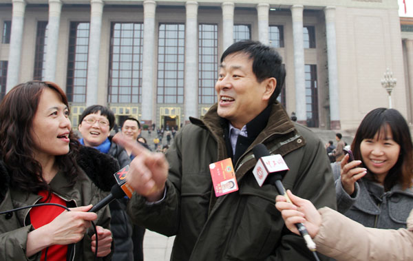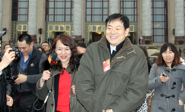 3月3日,中国人民政治协商会议第十一届全国委员会第五次会议在北京人民大会堂开幕。图为濮存昕委员接受媒体采访。中国文艺网 王春梅 摄