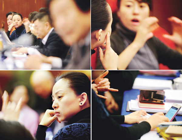3月4日,在文艺界小组讨论会上,全国政协委员邰丽华通过翻译的手语“聆听”会议发言。新华社记者 燕雁 摄