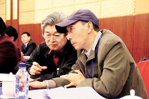 3月9日,杨力舟委员(左)与韩书力委员交流提案。中国文艺网 张悦 摄