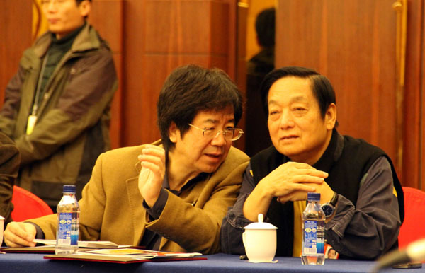 3月9日,韩美林委员(右)和滕矢初委员亲切交谈。中国文艺网 张悦 摄