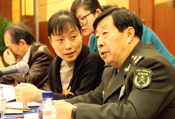 3月9日,刘大为委员(右)与盛小云委员相互讨论提案。中国文艺网 张悦 摄