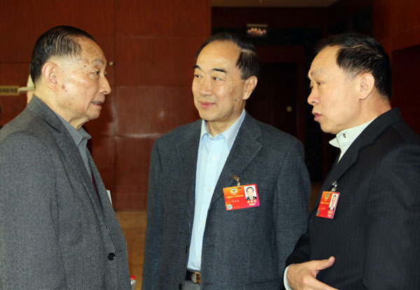 3月12日,梅葆玖委员(左)、叶少兰委员(中)、王立军委员讨论戏剧发展。