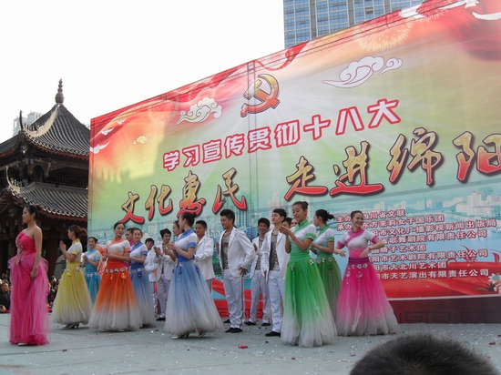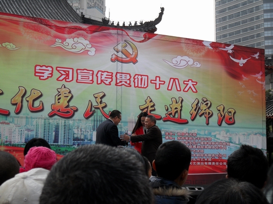 12月1日下午,由省文联主办,东方茉莉女子国乐团、绵阳市文化广播影视新闻出版局承办,四川省歌舞剧院有限责任公司、中国娇子艺术团等单位协办的“送欢乐、下基层、情系百姓——走进绵阳”文艺演出活动在涪城区铁牛广场举行。现场观众达3000余人,热闹非凡,喜庆洋溢,充分展现了绵阳人民学习宣传贯彻十八大的热情和永远跟党走、建设美好新绵阳的坚定信心。