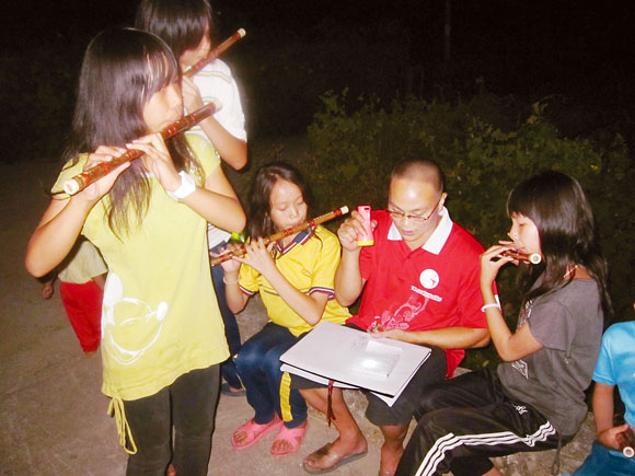 广东省文联驻村干部、文艺支教老师陈龙武利用学生课余时间教孩子们吹笛子