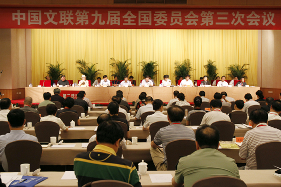 7月5日,中国文联第九届全国委员会第三次会议在京召开。全国政协副主席、中国文联主席孙家正主持会议。中国文联党组书记、副主席赵实,中国文联党组副书记、副主席覃志刚、李屹,中国文联党组成员、副主席杨承志,中国文联党组成员左中一,中国文联党组成员、书记处书记夏潮,中组部干部三局巡视员、副局长赵凡,中宣部文艺局巡视员、副局长孟祥林,中国文联副主席丹增、冯远、边发吉、刘兰芳、李雪健、李维康、陈晓光、迪丽娜尔·阿布都拉、赵化勇、段成桂、徐沛东、奚美娟、黎国如和中国文联主席团委员、全委会委员出席会议。中组部、中宣部有关部门负责同志,有关全国文艺家协会主席,中国人民银行文联负责同志,有关全国文艺家协会、中国文联有关机关部室和直属单位负责同志列席会议。