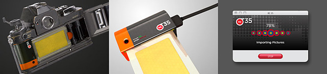 这个名叫RE-35的小东西便是实现让传统底片机拍摄数码照片的神奇“胶卷”。RE-35的使用方法和传统35mm底片基本没有区别,将它安装到相机的胶卷舱内,拉出感光条,给相机上弦便可拍摄。而照片以数码的形式记录在RE-35内,通过USB传输线便可导入到你的电脑中,将你老旧的相机重新恢复生机。