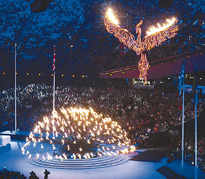 8月12日,第三十届夏季奥林匹克运动会闭幕式在伦敦奥运会主体育场举行。图为奥运圣火在闭幕式上如花瓣展开,一只火凤凰飞起。