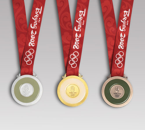 北京2008年奥运会奖牌直径为70毫米,厚6毫米。奖牌正面为国际奥委会统一规定的图案——插上翅膀站立的希腊胜利女神和希腊潘纳辛纳科竞技场。奖牌背面镶嵌着取自中国古代龙纹玉璧造型的玉璧,背面正中的金属图形上镌刻着北京奥运会会徽。人们形象地叫他金(银,铜)镶玉奖牌。北京奥运会奖牌中国特色浓厚,艺术风格尊贵典雅,和谐地将中国文化与奥林匹克精神结合在一起。以其奖赠奥运成绩优胜者,是一种崇高的荣誉和礼赞。