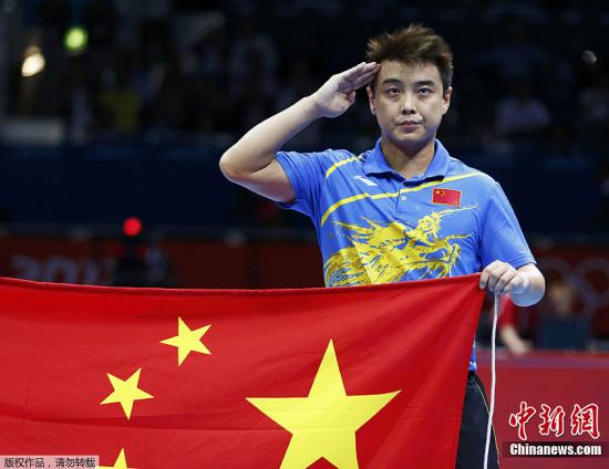 当地时间8月2日,2012年伦敦奥运会乒乓球男单决赛,中国选手张继科以4:1战胜队友王皓夺冠。图为王皓举国旗敬礼。