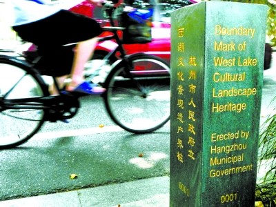 西湖文化景观遗产界桩自2010年6月底开始安装,1383个界桩连成了西湖文化景观遗产范围。这是0001号界桩。