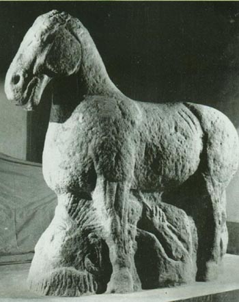 其中“马踏匈奴”为墓前石刻的主像,长 1.9 米,高 1.68米,为灰白细砂石雕凿而成,石马昂首站立,尾长拖地,腹下雕手持弓箭匕首长须仰面跼蹙挣扎的匈奴人形象,是最具代表性的纪念碑式的作品。这组石刻都是将一块整石运用线雕、圆雕和浮雕的手法雕刻而成。材料选择和雕刻手法与形体配合,有的注重形态,有的突出神情,形神兼备。猛兽则表现凶猛,马则表现跃起注视前方,牛、象则表现温顺,神态各异。从铭文刻石推断,这批石刻当是少府左司空监造的。