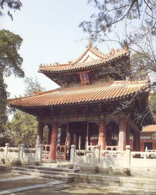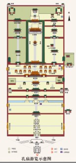 孔庙[1](北孔)位于东经116°58’30”----北纬35°36’42”。曲阜孔庙(ConfuciusTemple)是祭祀孔子的本庙,是分布在中国、朝鲜、韩国、日本、越南、印度尼西亚、新加坡、美国等国家2000多座孔子庙的先河和范本,据称孔庙始建于公元前478年,孔子死后第二年(公元前478年),鲁哀公将其故宅改建为庙。此后历代帝王不断加封孔子,扩建庙宇,到清代,雍正帝下令大修,扩建成现代规模。庙内 共有九进院落,以南北为中轴,分左、中、右三路,纵长630米,横宽140米,有殿、堂、坛、阁460多间,门坊54座,“御碑亭”13座,拥有各种建筑100余座,460余间,占地面积约95000平方米的庞大建筑群。孔庙内的圣迹殿、十三碑亭及大成殿东西两庑,陈列着大量碑碣石刻,特别是这里保存的汉碑,在全国是数量最多的,历代碑刻亦不乏珍品,其碑刻之多仅次西安碑林,所以它有我国第二碑林之称。孔庙是中国现存规模仅次于故宫的古建筑群,是中国三大古建筑群之一,堪称中国古代大型祠庙建筑的典范。