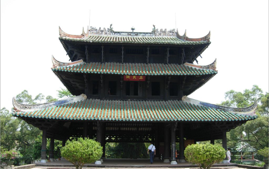真武阁,全阁为杠杆式纯木结构,通高13.2米,面宽13.8米,进深11.2米,全阁不用一件铁器,用近3000条格木构件,以杠杆结构原理,串联吻合,彼此扶持,互相制约,合理协调组成一个优美稳固的统一整体。二层楼的四根大内柱,虽承受上层楼板、梁架、配柱和阁瓦、脊饰的沉重荷载,柱脚却悬空不落地,是全阁结构中最精巧、最奇特的部分。它依靠杠杆原理,像天秤一样维持整座建筑的平衡。真武阁结构之奇巧,举世无双。400多年来,真武阁经历了5次地震,3次特大台风,仍安然无恙。真武阁被誉为“天南杰构”,与岳阳楼、黄鹤楼、滕王阁合称江南四大名楼,是唯一一座没有进行重建而完整保留至今的四大名楼。
