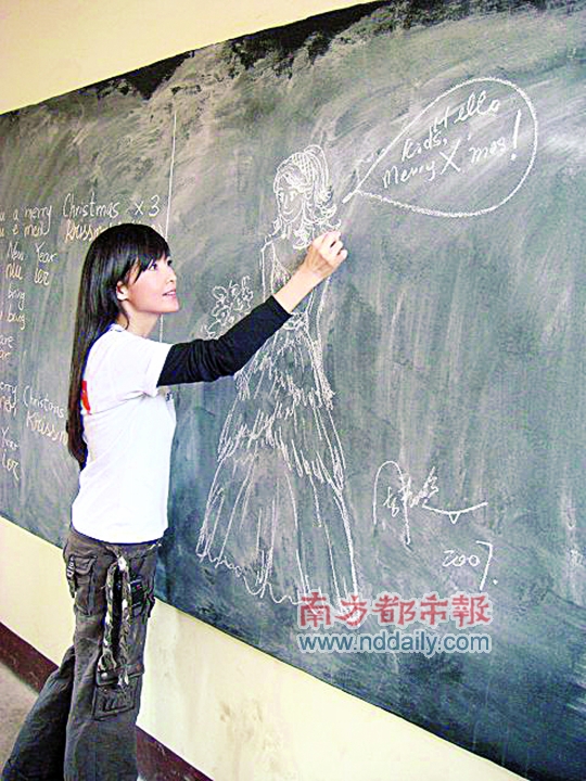 周慧敏探访贫困山区儿童时即兴画画。