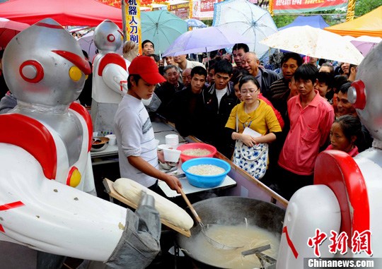 图为一参展商现场推出机器人刀削面,吸引众人围观品尝。 中新社发 刘可耕 摄