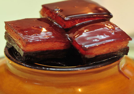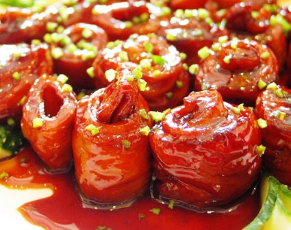 坛子肉又叫辣酱肉,“坛子肉”是济南名菜,起源于三国时期,为名将赵子龙所喜爱。坛子肉选用新鲜猪肉皮和五花肉为原料,特选本地特产方园五爪辣椒为配料,结合民间传统工艺配方精制而成。坛子肉色泽红润,汤浓肉烂,肥而不腻,香辣可口,回味悠长,具有开胃健脾、增进食欲等功效,为郴州三宝之一。