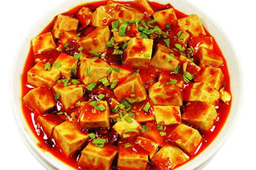 一百八十年前,四川省成都市靠近郊区的万福桥,有个叫陈春富的青年和他的妻子刘氏,在这里开了一家专卖素菜的小饭铺。成都附近彭县、新繁等地到成都的行人和挑担小贩,很多人都喜欢在万福桥歇脚,吃顿饭,喝点茶。刘氏见到客人总是笑脸相迎热情接待。刘氏烧的豆腐两面金黄又酥又嫩,客人们很爱吃。有时遇上嘴馋的顾客要求吃点荤的,她就去对门小贩处买回牛肉切成片,做成牛肉烧豆腐供客人食用。 刘氏聪明好学,能虚心听取顾客们的意见,改进烹调方法,譬如下锅之前先将豆腐切成小块,用淡盐水焯一下,使豆腐更加软嫩。牛肉由切成块状变成细粒。刘氏做这道菜,除了注重调料的搭配,更注意掌握火候。她烹制的牛肉烧豆腐,具有麻、辣、香、烫、嫩、酥等特点,很多人吃起来烫得出汗,全身舒畅,吃了还想吃,因此招来不少回头客。 刘氏小时候出过天花,脸上留下几颗麻点,来往的客人熟了,就取笑叫她麻嫂,她也从不见怪。后来年纪大一点,人们改口叫麻婆。她做牛肉烧豆腐出了名,于是就成了"麻婆豆腐"。在国外数以千计的中餐厅里,也都以麻辣豆腐做当家菜享誉海外,它的名声有时甚至超过北京烤鸭。