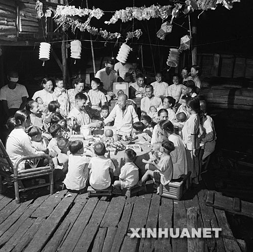 这是20世纪50年代,81岁的老渔民郭汝一家四代同堂共55人在中秋节夜大团聚,欢度佳节(资料照片)。 新华社发