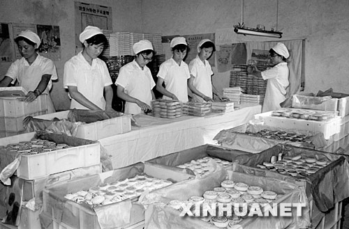 这是1980年9月11日,在中秋节前夕,北京市宣武糕点厂生产的月饼正在装盒,准备供应节日市场(资料照片)。 新华社发