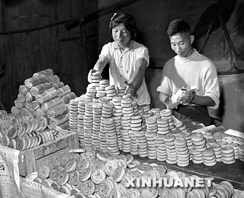 这是1961年9月21日,山西省闻喜县东镇供销合作社的工作人员在包装月饼,准备供应农民过中秋节(资料照片)。 新华社发
