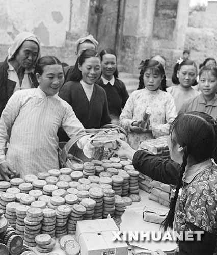 这是1963年中秋节,山西省运城县大渠公社寺北村大队的社员在购买本村供销点供应的月饼(资料照片)。 新华社发