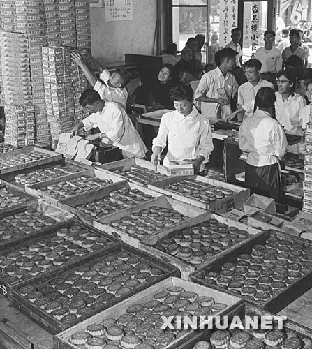 这是1963年中秋节前夕,上海著名的杏花楼制作的月饼在门市部供应(资料照片)。 新华社发