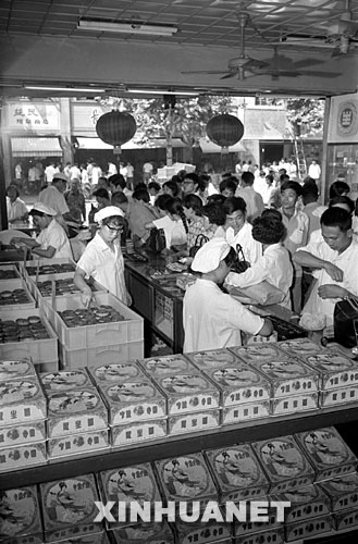 这是20世纪90年代初,广州一饼家在中秋前夕设点为顾客代办月饼邮寄业务,为各地的华人华侨传递浓浓的乡情。这位章先生受在上海哥哥的委托,特地买一盒正宗的粤式月饼,寄给台北市的亲人(资料照片)。 新华社发